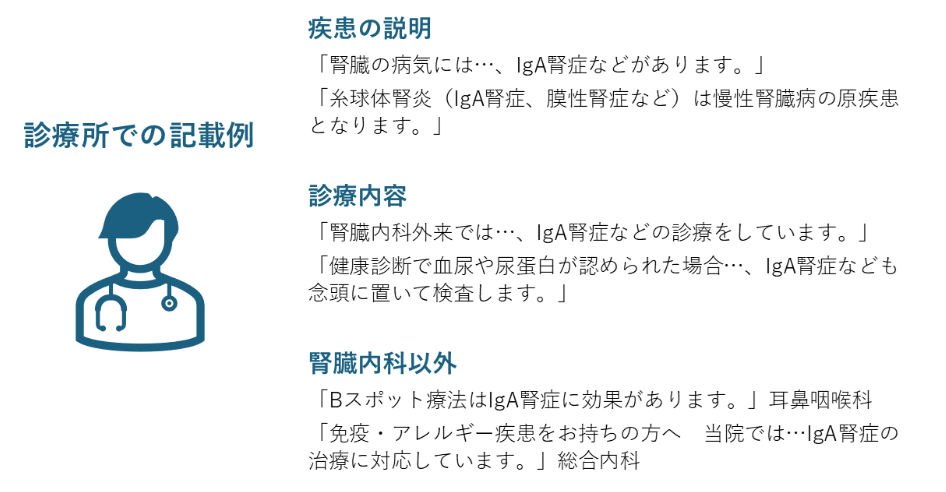 診療所では腎臓内科に限らず、一般内科、耳鼻咽喉科、アレルギー科、小児科など幅広い診療科からIgA腎症に関する説明を確認 しました。