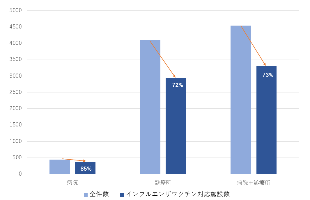 F県内の医療機関を対象に、インフルエンザワクチン接種への対応状況を確認したところ、病院では約85%、診療所では約72%の施設が対応していました(※)。