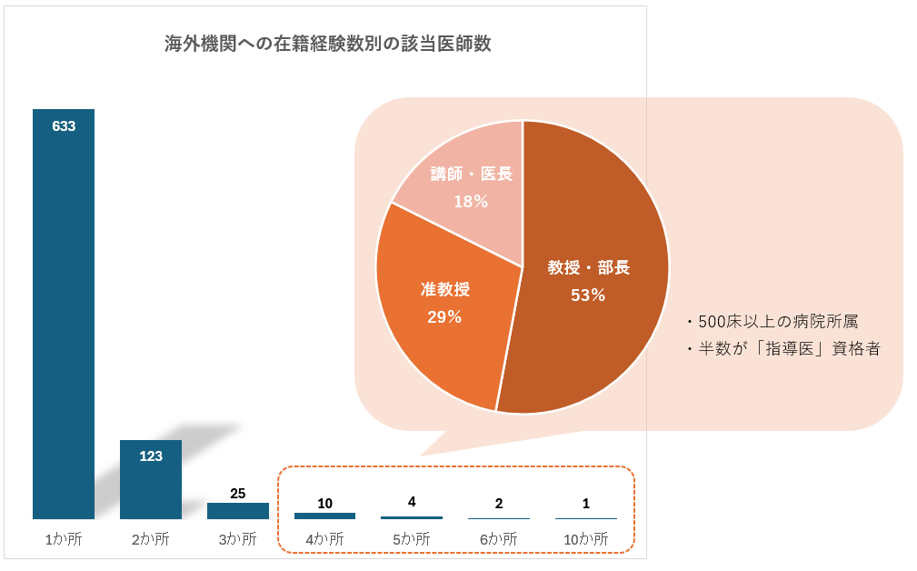海外機関への在籍がまだ1か所しか確認できない医師が大半ですが、将来的に国内外の機関で診療や研究を重ね、診療分野のトップ層に立つ可能性のある医師集団であるとも考えられます。