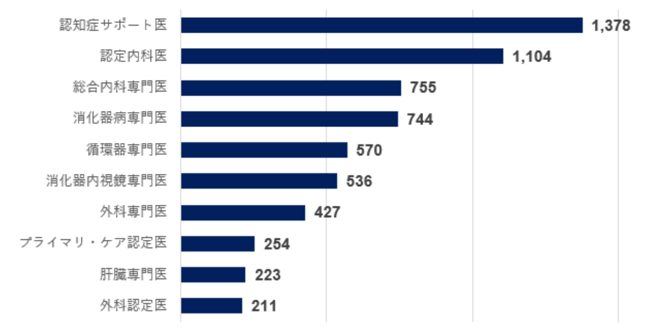 認知症サポート医、消化器専門医、循環器専門医など、特定の疾患領域において介護施設で中心的役割を担う医師の把握は、重点領域における精緻なターゲティングにつながります。