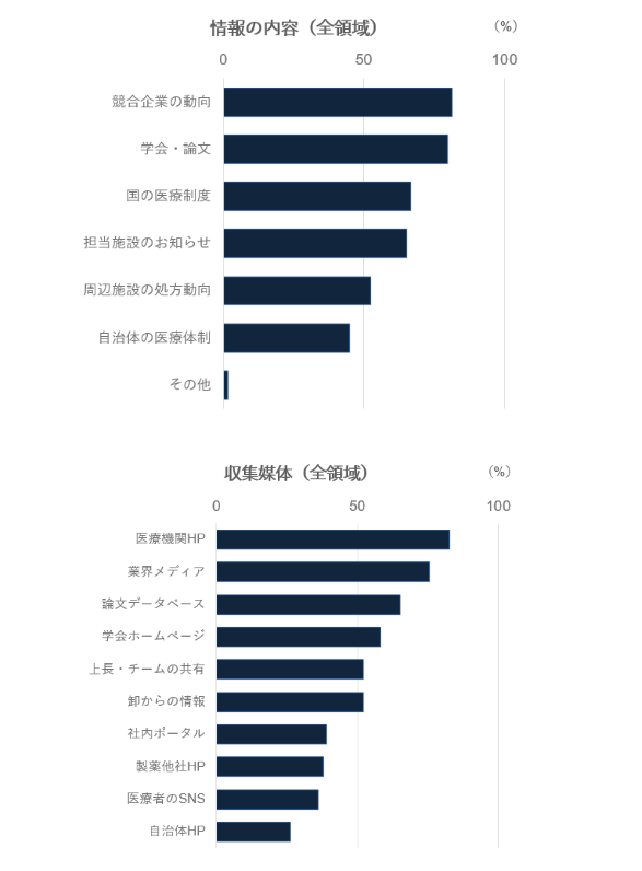 - 日常的に収集している情報としては、競合企業の動向、学会・論文発表など、処方の方針に直結しやすい情報が上位を占めました。