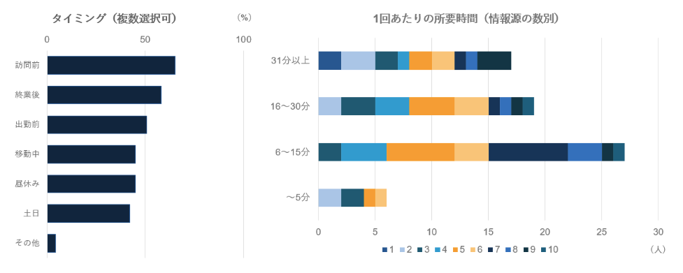 - 情報収集のタイミングは、訪問前や勤務時間の前後が上位に挙がりました。