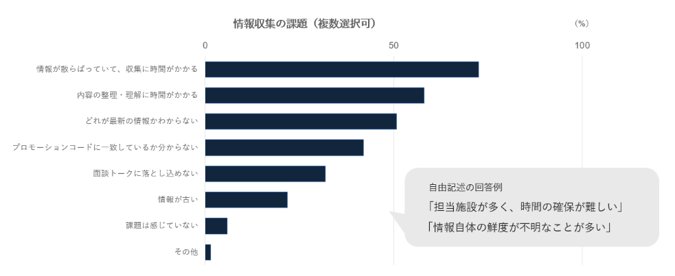 - また、「担当施設数が多く、各施設の情報の信頼性確認や深掘りまで手が回らない」といった、複合的な課題も多く挙げられました。