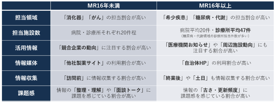 - MR経験16年未満の回答者は、情報の整理や面談トークへの落とし込みなど、情報の活用方法に課題を感じる傾向が見られました。