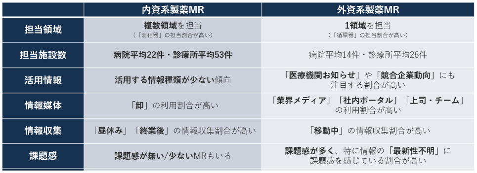 - 外資系製薬企業のMRは、内資系企業よりも担当医療機関数が少なく、活用している情報種類が多様な傾向が見られました。