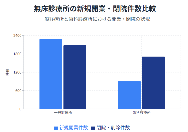 一見すると、街のクリニックの数はそれほど変わっていないように感じるかもしれません。ですが、その水面下では、毎年数千もの施設が開業し、ほぼ同じ数が市場から姿を消しているという、想像以上に活発な新陳代謝が繰り返されています。