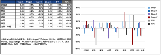 5大がん(胃・肺・乳・大腸・肝)について、地域ごとにStage I〜IV・不明・再発の構成比が前年(2023年→2024年)で何pt動いたか(前年差)を集計。