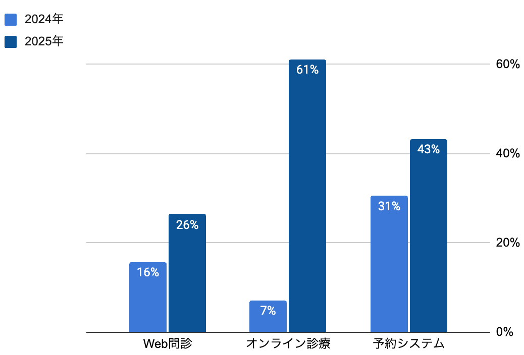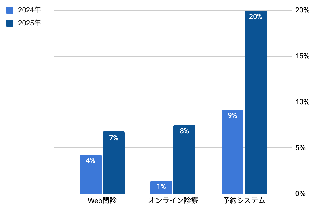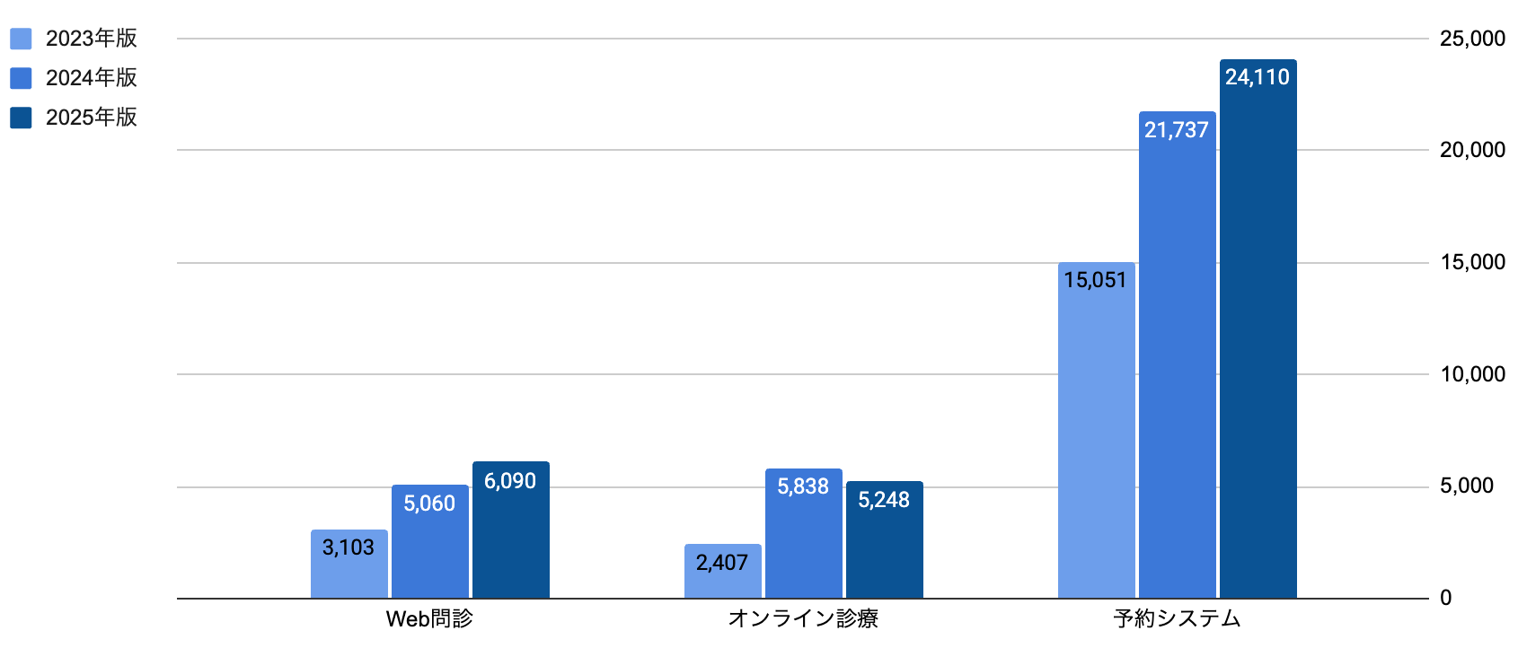 Web問診・オンライン診療・予約システムはいずれも導入件数が増加し続けていますが、裾野拡大が一巡したことで成長率は鈍化。特に予約システムは最大規模の市場でありながら、成長は三年目で落ち着きを見せています。
