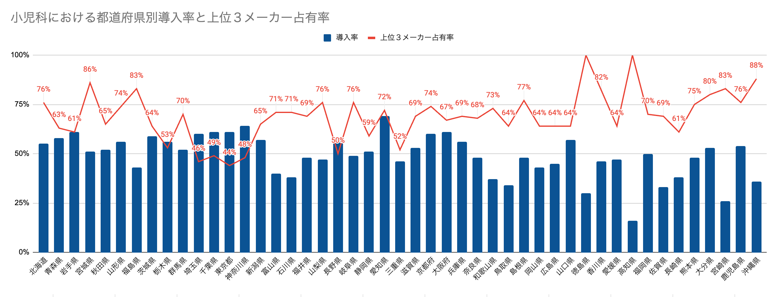 小児科は全国平均で導入率55%・上位3メーカー占有率54%と最も成熟した市場ですが、都道府県別に見ると導入率には大きな差があり、地域によってはまだ伸び代が残っているようです。そのため、地域ごとの特性に応じたアプローチや広報戦略が重要になります。