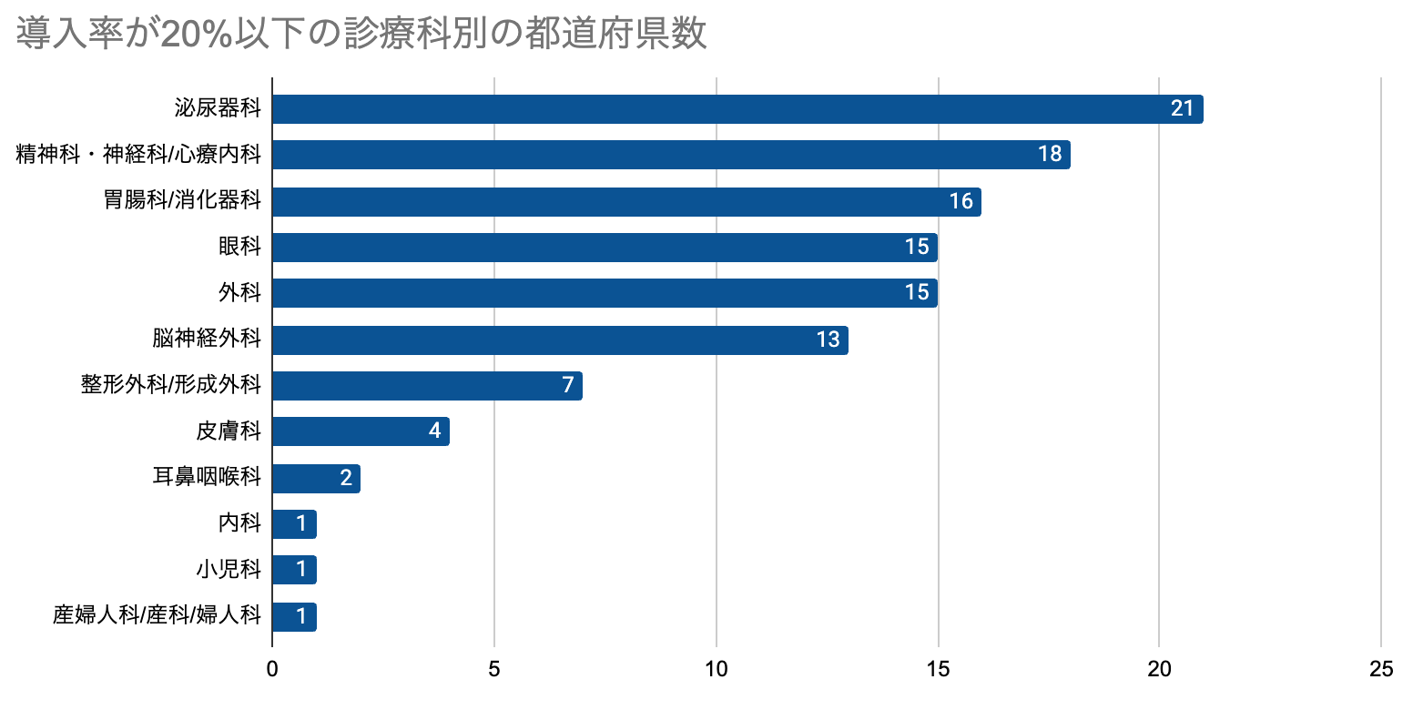 また、主たる診療科別に「診療予約システムの導入率が20%未満の都道府県がいくつ存在するか」を主たる診療科別に集計したところ、泌尿器科(21都道府県)、精神科・心療内科(18都道府県)、胃腸科/消化器科(16都道府県)等となりました。