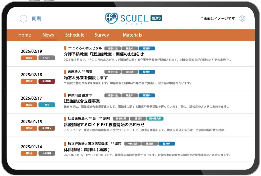 SCUEL NEWSは、病院・自治体の公式サイトに掲載される「お知らせ」を毎日自動で収集し、施設名や記事のカテゴリ、関連疾病名などの属性を付与して提供するデータサービスです。