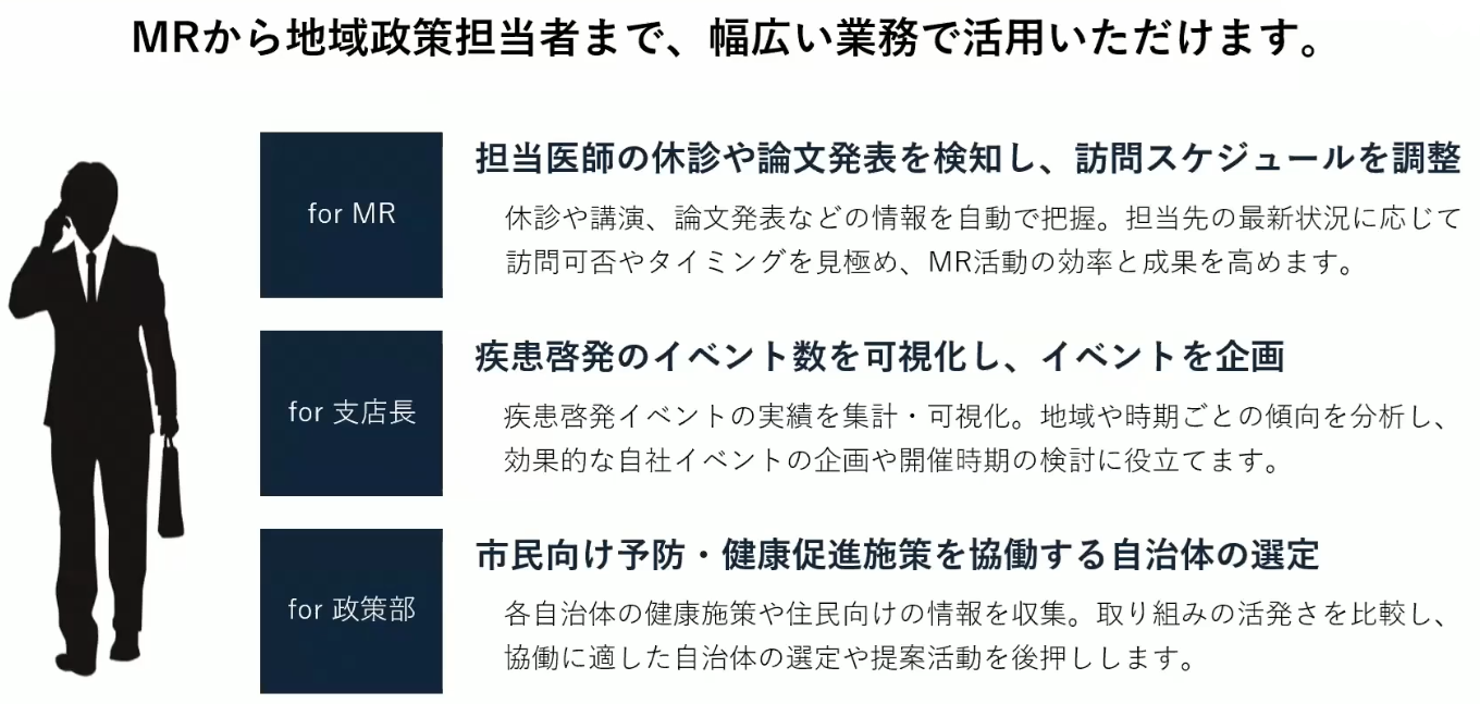| 診療科の新設・医師の異動 | 新しい診療科の開設や医師の着任・異動 | 新規訪問のタイミング把握、関係構築の初期接点に。 |