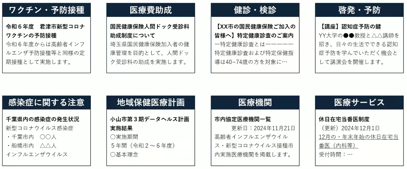 | 講演会・市民講座・学術発表 | 医師が参加・講演するイベントや論文発表の情報 | 医師との面談時に話題提供が可能。関係構築のきっかけに。 |